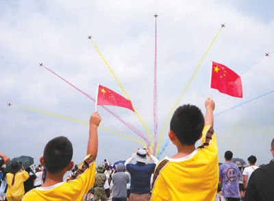 勁舞藍天,精彩紛呈。本屆航空開放活動上,空軍八一飛行表演隊換裝殲—10C后首次在國內公開亮相,在20分鐘的時間里,6架殲—10C展示了六機大箭隊通場變雙三角隊、六機橫滾、五機水平開花等一連串驚險動作,在空中“織出”道道彩練。“在北國春城進行飛行表演,是一種對東北老航校精神的傳承,我們的飛行員都是從這里起航的。”在表演結束后,空軍八一飛行表演隊何曉莉說。