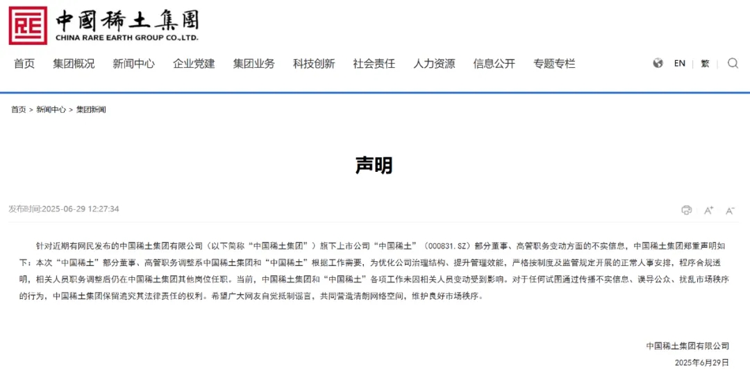 針對近期有網民發布的中國稀土集團有限公司旗下上市公司“中國稀土”(000831.SZ)部分董事、高管職務變動方面的不實信息,中國稀土集團官網6月29日發布聲明,內容如下: