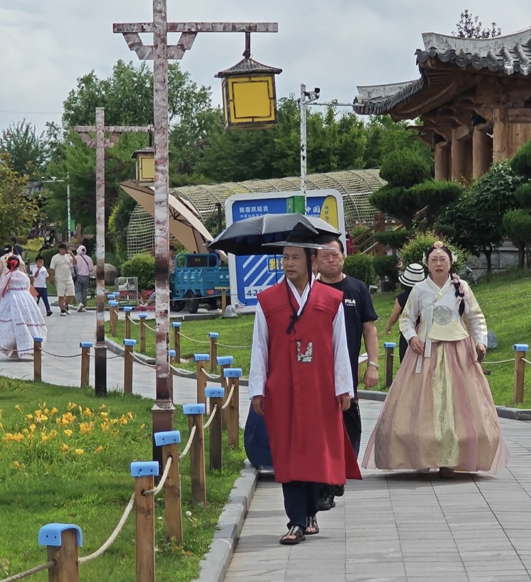 7月2日,中國朝鮮族民俗園里熱鬧非凡,來自全國各地不同民族的游客身著朝鮮族傳統(tǒng)服飾,在黛瓦白墻、飛檐翹角的傳統(tǒng)建筑前拍照打卡,體驗朝鮮族傳統(tǒng)文化獨特魅力的同時,不同民族的文化也在互動中碰撞出溫暖的火花,讓帽兒山腳下的這座園區(qū)成為各民族交往交流交融的生動舞臺。