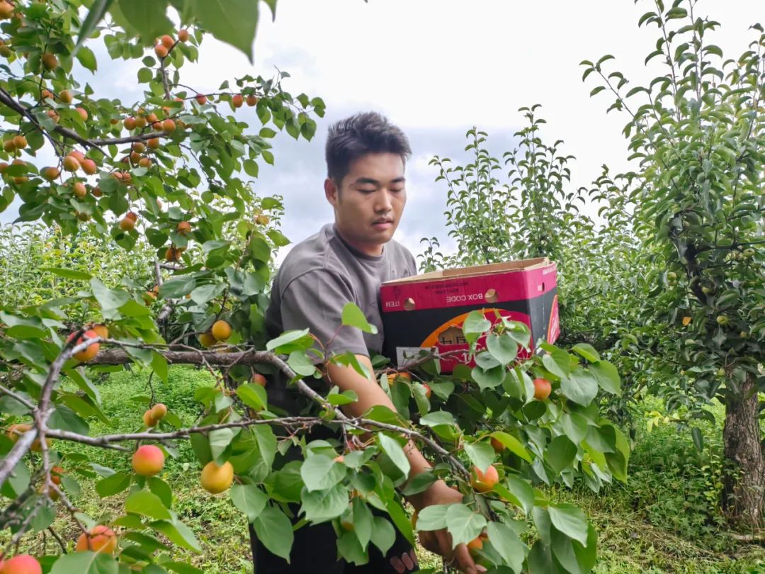 “這個(gè)成熟度剛剛好,入口軟糯香甜!”7月21日上午,果園里的杏樹(shù)像被打翻了的胭脂盒,滿枝的紅杏擠擠挨挨,在綠葉間閃著瑪瑙般的光,抬頭就是藍(lán)天白云當(dāng)背景,隨手一拍都是幅鮮活的田園畫(huà)。果園負(fù)責(zé)人孫星辰站在梯子上,小心翼翼地將一顆大紅杏從枝頭摘到籃子里。籃子里的杏已經(jīng)堆成了小山,金黃的果皮上點(diǎn)綴著成熟的紅潤(rùn)。他踩著梯子挪了挪位置,又瞄準(zhǔn)一顆熟透的杏子:“這黃金大杏?jì)少F得很,摘的時(shí)候得扭一下,不然掉地上就磕壞了。”樹(shù)下,幾名工人正忙著把竹籃里的杏子倒進(jìn)紙箱,25公斤一箱的標(biāo)準(zhǔn)箱很快就被填得滿滿當(dāng)當(dāng)。