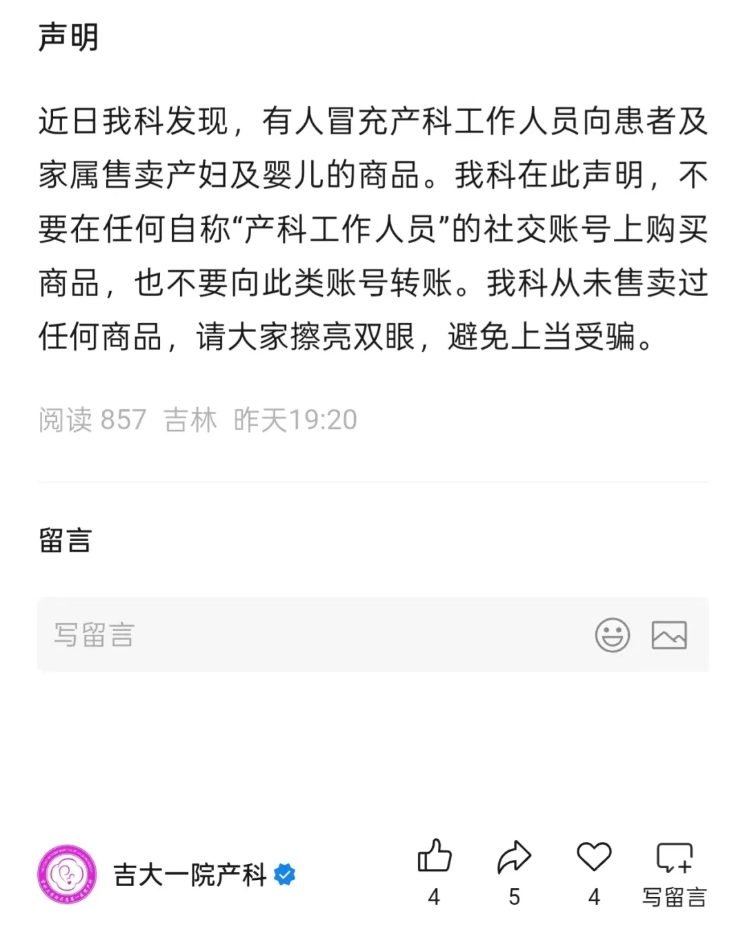 7月23日,吉林大學第一醫院產科發布關于警惕冒充產科工作人員向患者及家屬售賣產婦及嬰兒商品的聲明。聲明指出,吉林大學第一醫院產科發現,有人冒充產科工作人員向患者及家屬售賣產婦及嬰兒的商品。該科室從未售賣過任何商品,請廣大患者及家屬不要在任何自稱“產科工作人員”的社交賬號上購買商品,也不要向此類賬號轉賬。請大家擦亮雙眼,避免上當受騙。