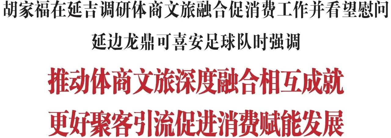 7月26日,省委常委、州委書記胡家福到延吉市就體商文旅融合促消費工作進行實地調研,并看望慰問延邊龍鼎可喜安足球隊。他強調,要深入貫徹習近平總書記在聽取吉林省委省政府工作匯報時的重要講話精神,主動順應消費升級新趨勢,精準把握市場需求新動向,推動體商文旅深度融合、相互成就,打造更多豐富多元、特色鮮明的新場景新業態,更好聚客引流、促進消費、賦能發展。