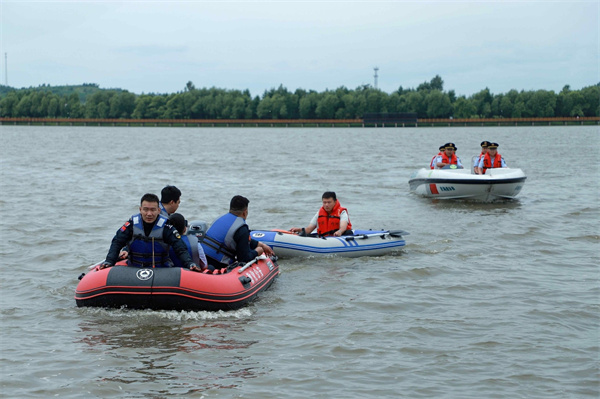 交警大隊(duì)負(fù)責(zé)對(duì)景區(qū)外圍封控,開通救援通道;圖偵大隊(duì)操作無人機(jī)向被困人員投放救生衣和餐飲物品;特警大隊(duì)與交通局執(zhí)法大隊(duì)聯(lián)動(dòng)配合,迅速完成船艇組裝,隊(duì)員們面對(duì)復(fù)雜水流,運(yùn)用“S形繞樁”“360度回轉(zhuǎn)”等駕駛技術(shù),精準(zhǔn)完成遠(yuǎn)程拋投救援物資、沖鋒舟救援等科目,成功將“被困群眾”轉(zhuǎn)移至安全地帶。