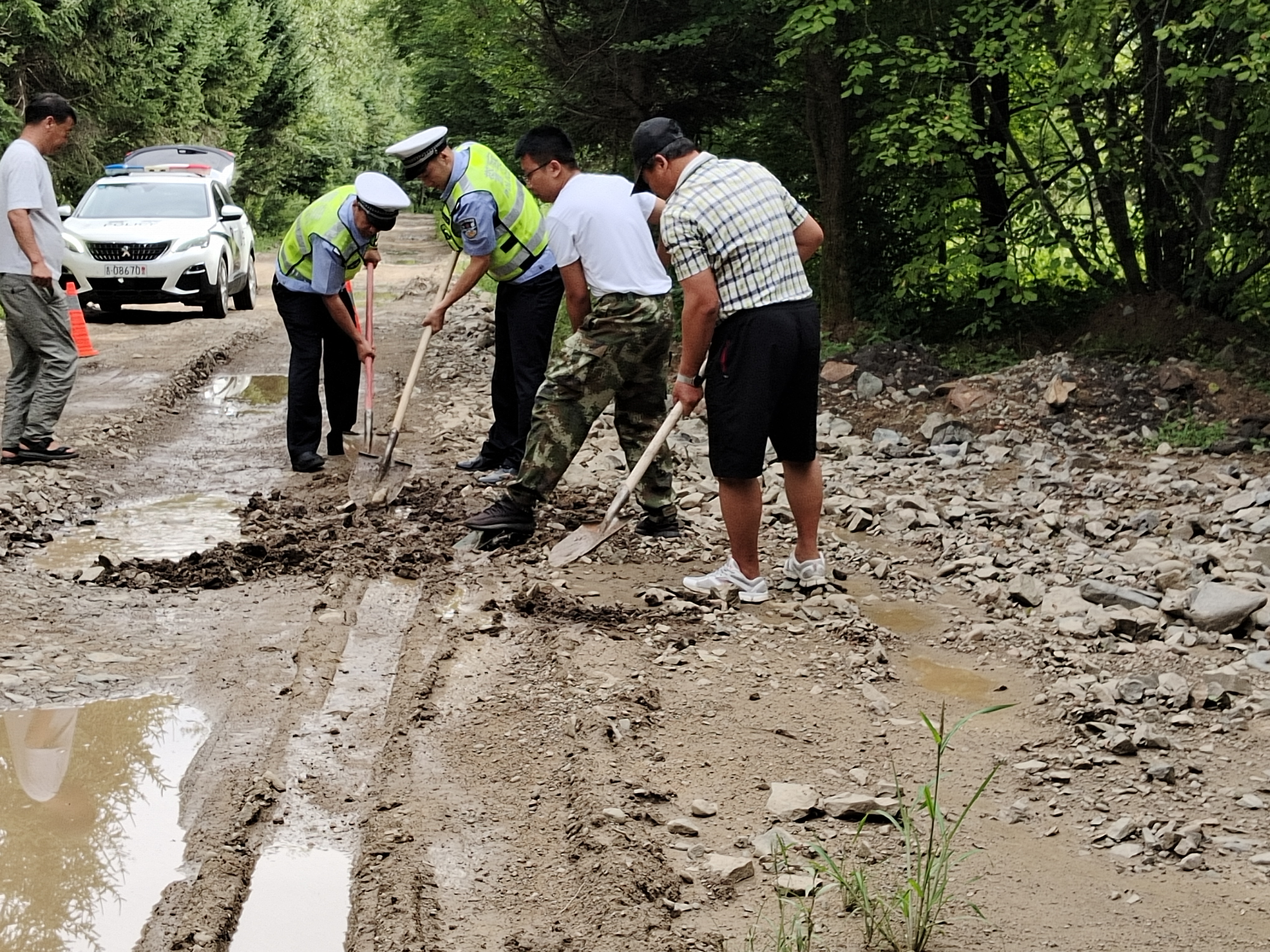 8月5日,民警在轄區日常巡邏執勤時,接到沙金溝林場群眾求助:沙柞線4公里路段因近期降雨出現路面積水且泥濘不堪,坑洼處深達十余厘米,過往車輛通行受阻,存在打滑、陷車風險。 民警第一時間趕赴現場查看路況,同時立即聯系汪清林業分公司安全防火處工作人員,詳細通報積水范圍、路面損毀情況,協商制定搶修方案。隨后,民警在現場設置警示標志,引導車輛減速繞行,維持交通秩序;同時對積水區域進行引流清理,對坑洼路段分層填埋砂石并壓實平整。