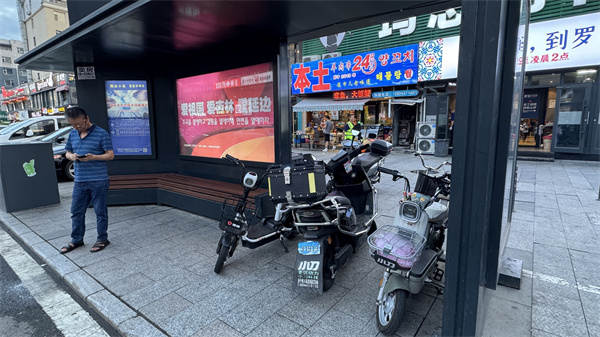 煙集街的公交站點設計簡單大方、功能完善,電子廣告屏、電子站牌、寬大的頂棚、舒適的座椅,都迎合著這條街的整體品位。但是本應給乘客站立的位置,卻停放了摩托車、自行車等兩輪車輛。車輛既有附近商鋪工作人員的,也有顧客的。停在站點里,主要是為了防曬和避雨。但在候車人員較多的時候,人們不得已只能站到站點外部。這種現象,幾乎在這條街的每個站點都存在。除此之外,也有商家把車停在供顧客休憩的涼亭里。