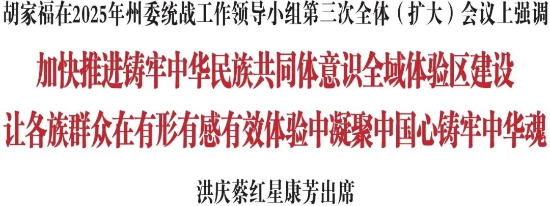 9月1日,省委常委、州委書記、州委統(tǒng)戰(zhàn)工作領導小組組長胡家福主持召開2025年州委統(tǒng)戰(zhàn)工作領導小組第三次全體(擴大)會議。他強調,要深入貫徹習近平總書記關于加強和改進民族工作的重要思想、關于鑄牢中華民族共同體意識的重要論述,準確把握新時代黨的民族工作新的階段性特征,加快推進鑄牢中華民族共同體意識全域體驗區(qū)建設,讓各族群眾在有形有感有效體驗中凝聚中國心、鑄牢中華魂。州委副書記、州長洪慶,州人大常委會主任蔡紅星,州政協(xié)主席康芳出席會議。