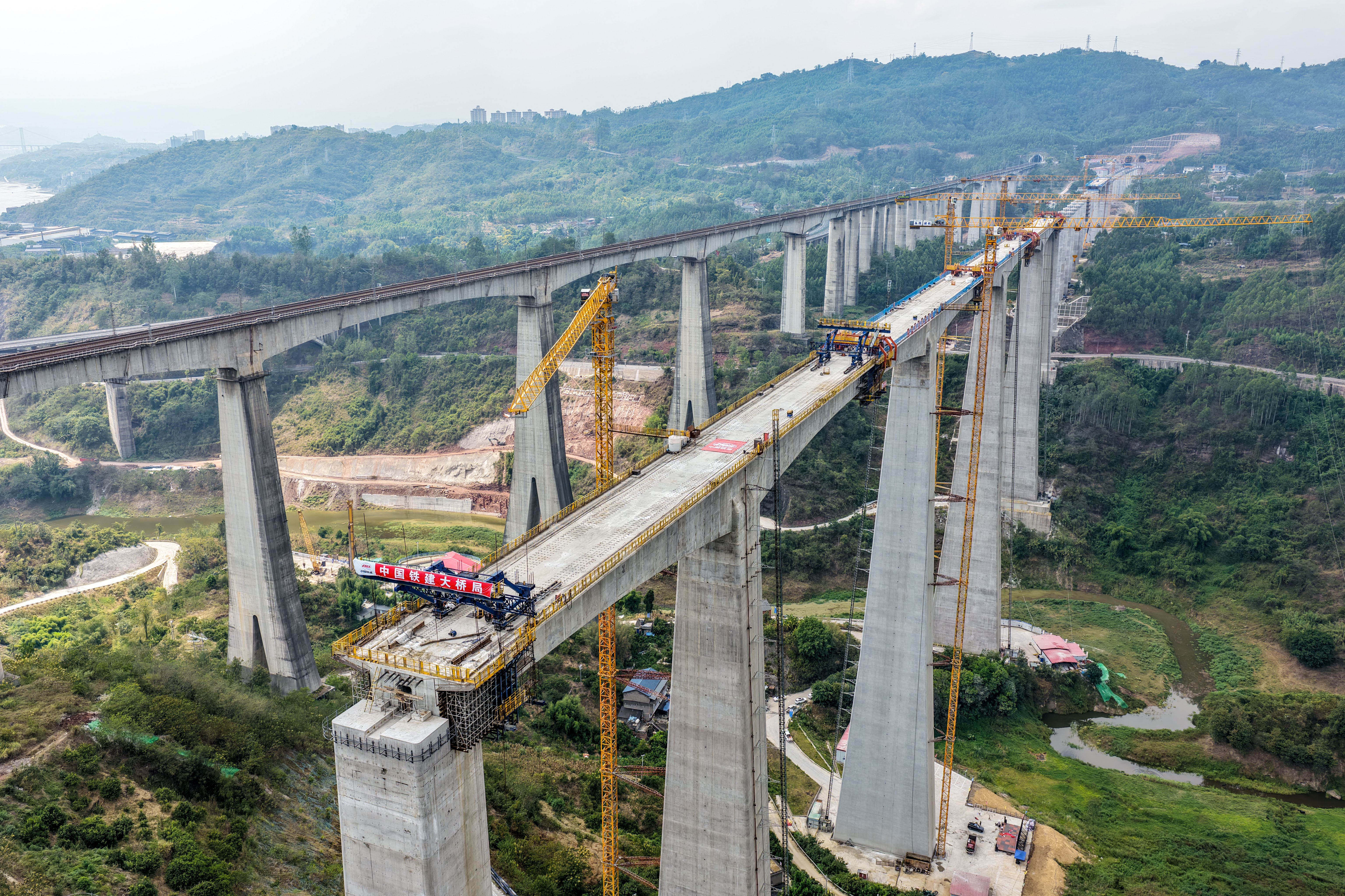 9月1日,由中國鐵建大橋局承建的新建重慶至萬州高速鐵路(渝萬高鐵)蔡家溝雙線特大橋順利合龍,為全線按期通車奠定堅實(shí)基礎(chǔ)。 蔡家溝雙線特大橋位于重慶市涪陵區(qū),橫跨長江支流,是全線重難點(diǎn)工程。大橋主跨采用連續(xù)剛構(gòu)設(shè)計,整體呈“兩端短、中間長”的對稱結(jié)構(gòu),總跨度達(dá)584米。 渝萬高鐵是我國“八縱八橫”高鐵網(wǎng)包(銀)海、京昆通道的組成部分,正線全長251公里,設(shè)計時速350公里。