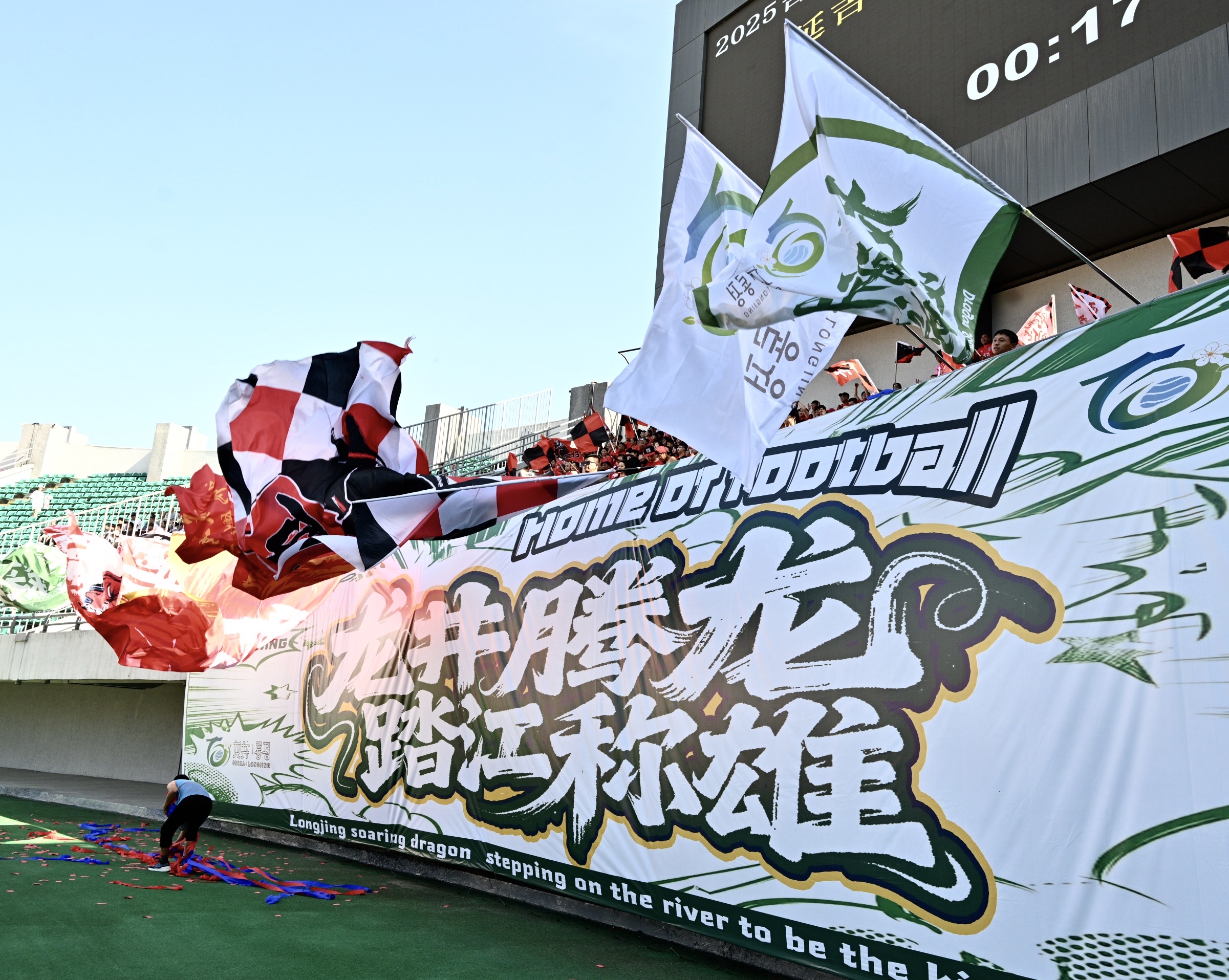 另一邊,比賽開始前一個多小時,龍井市800余名客場球迷組成的“遠征軍”已在體育場5號看臺集結。他們身著統一紅色助威服,十分醒目。看臺上,“龍井騰龍 踏江稱雄”的橫幅格外亮眼。比賽中,龍井球迷揮動旗幟、擂鼓吶喊,助威聲持續不斷。賽后,他們主動清理看臺上的垃圾,展現了文明觀賽的良好素養。龍井球迷劉瑞表示:“雖然這不是職業比賽,但大家的熱情讓人深受感染。接下來的比賽,我還會到現場為球隊加油。”