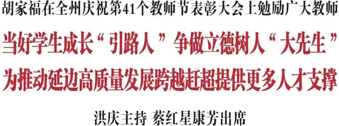 9月10日,全州慶祝第41個教師節(jié)表彰大會在延吉市舉行。省委常委、州委書記胡家福出席會議并講話。他強調(diào),全州廣大教師要深入貫徹習近平總書記關(guān)于教育的重要論述和習近平總書記給全國特崗教師代表重要回信精神,牢記為黨育人、為國育才的初心使命,當好學(xué)生成長“引路人” ,爭做立德樹人“大先生”,為推動延邊高質(zhì)量發(fā)展、跨越趕超提供更多人才支撐。州委副書記、州長洪慶主持會議。州人大常委會主任蔡紅星、州政協(xié)主席康芳出席會議。
