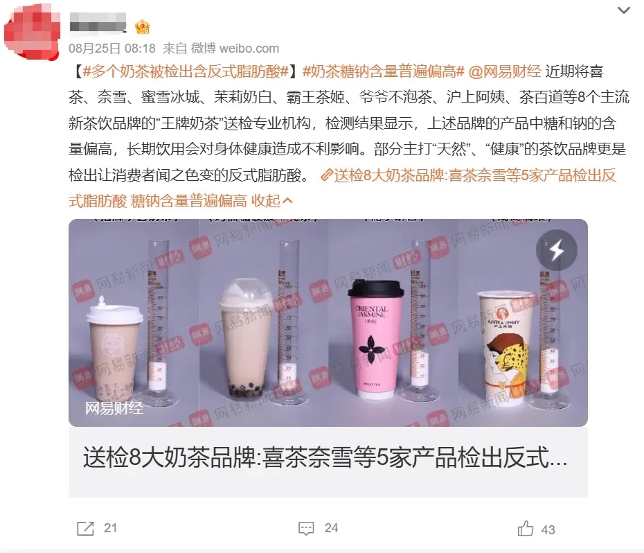 近日,一則“多款知名奶茶被檢出反式脂肪酸”的新聞沖上熱搜,瞬間給無數奶茶愛好者心頭蒙上了一層陰影。
