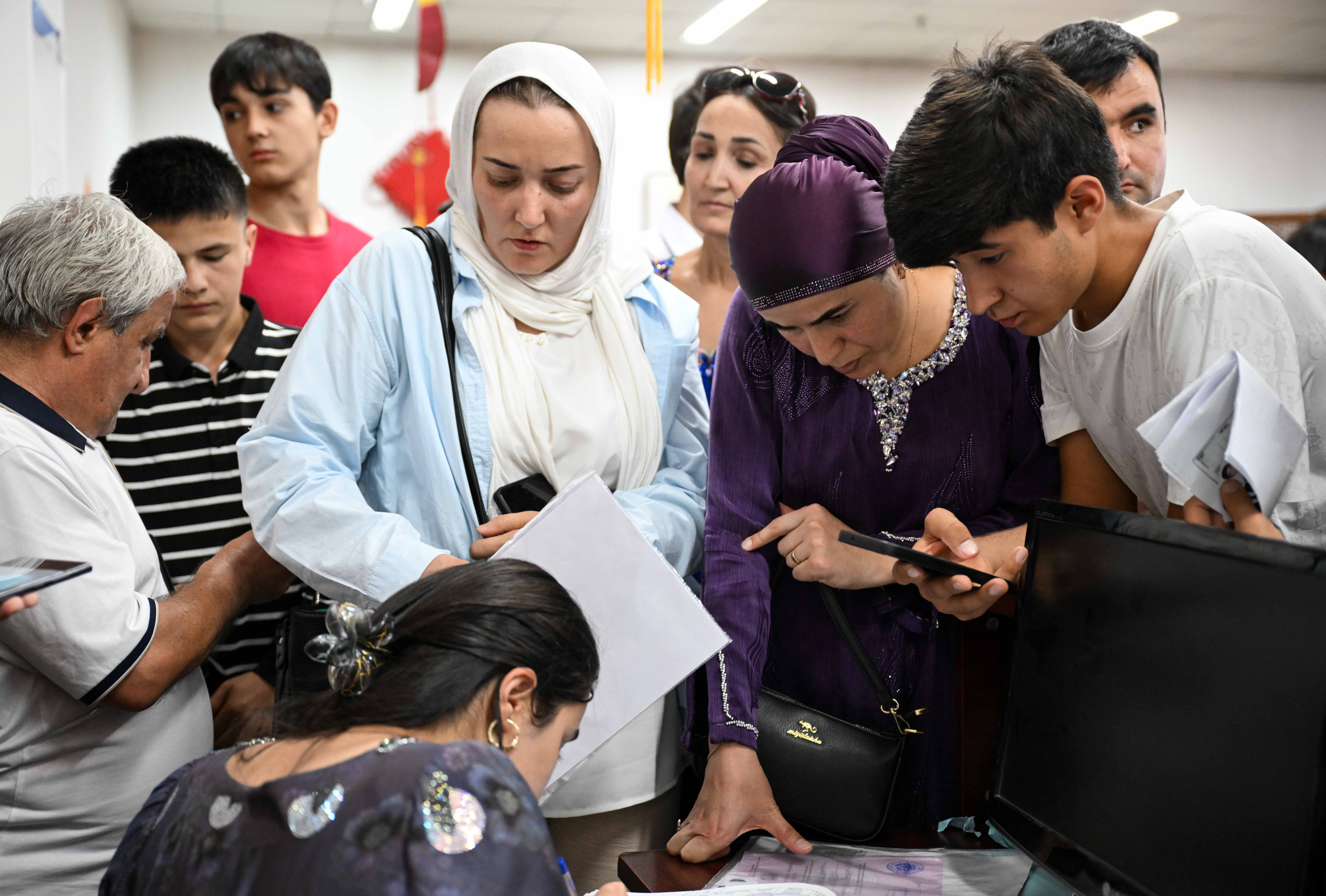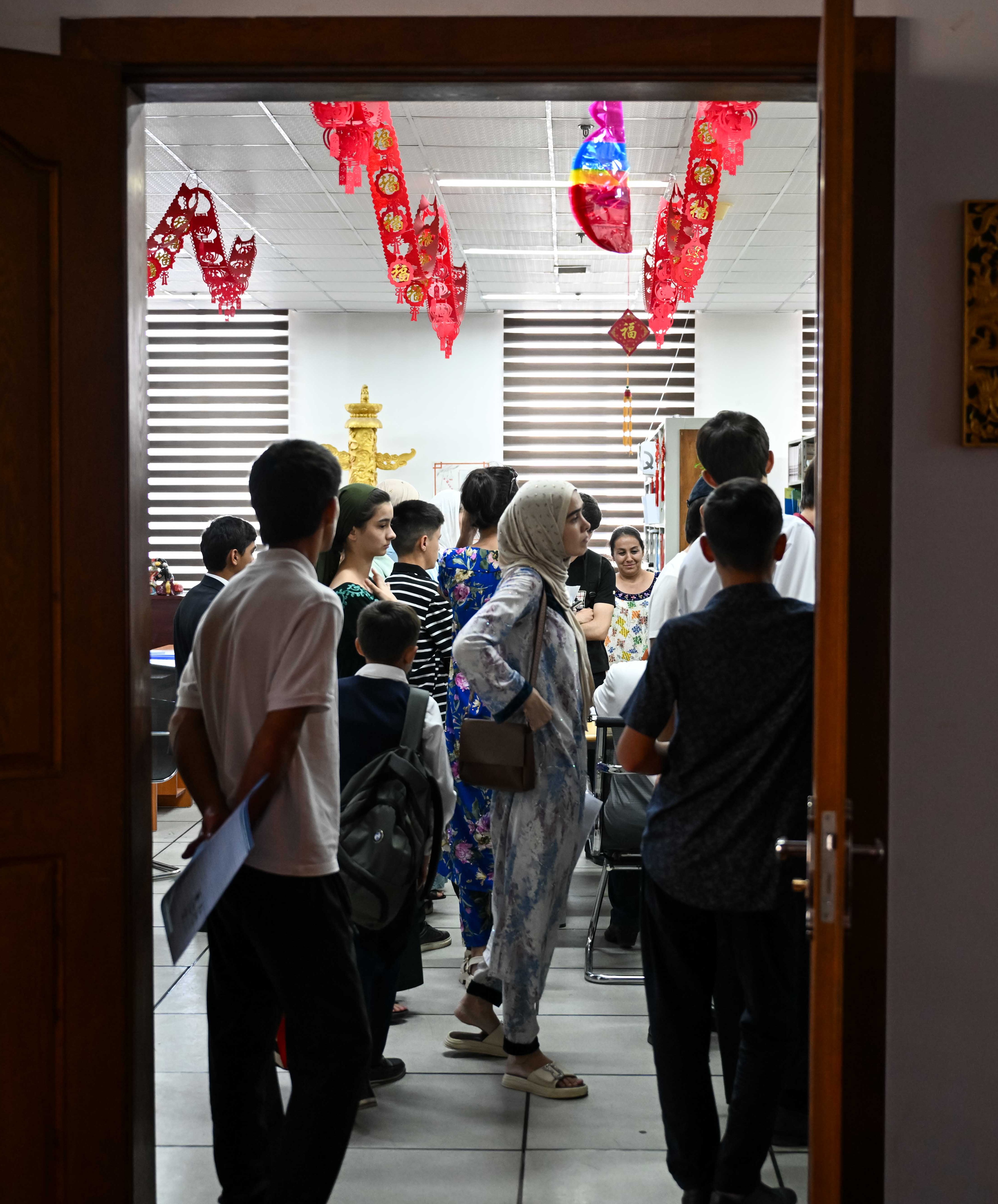 9月12日,在塔吉克斯坦首都杜尚別的國家圖書館中國廳,學生家長在為孩子報名。