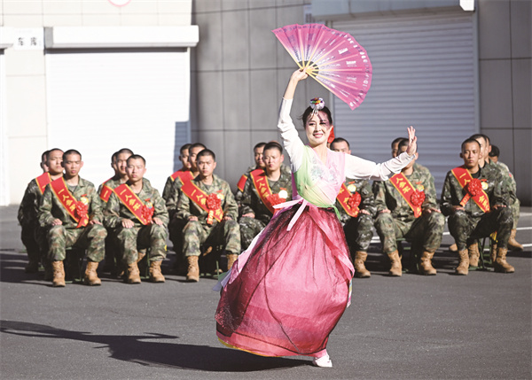 隨后,一場溫情又激昂的文藝演出點燃現(xiàn)場氛圍。混聲合唱《最美的歌兒獻給媽媽》傳遞家國情懷,男生獨唱《當那一天來臨》盡顯軍人擔當,獨舞《道拉吉》展現(xiàn)民族風采,表演唱《五好紅花寄回家》承載美好祝福。精彩節(jié)目輪番上演,為新兵們送上最真摯的鼓勁與祝福,現(xiàn)場掌聲與歡呼聲不斷。