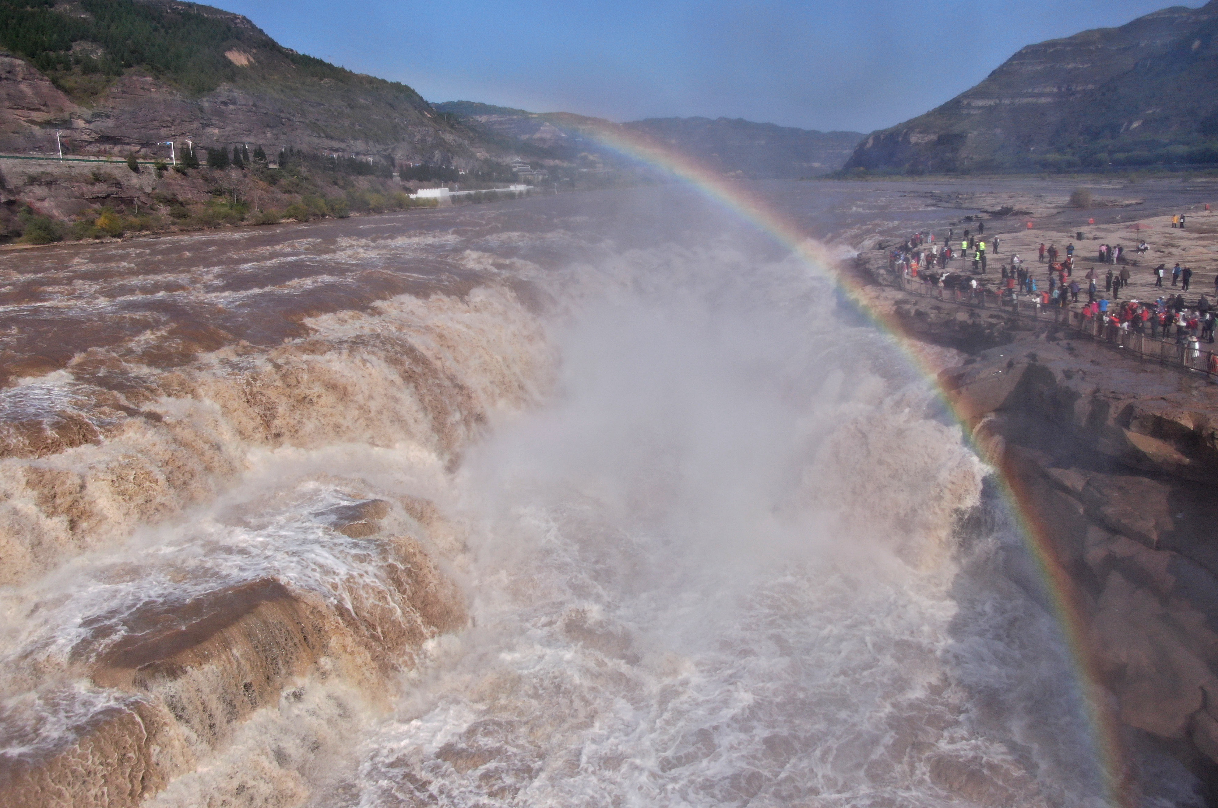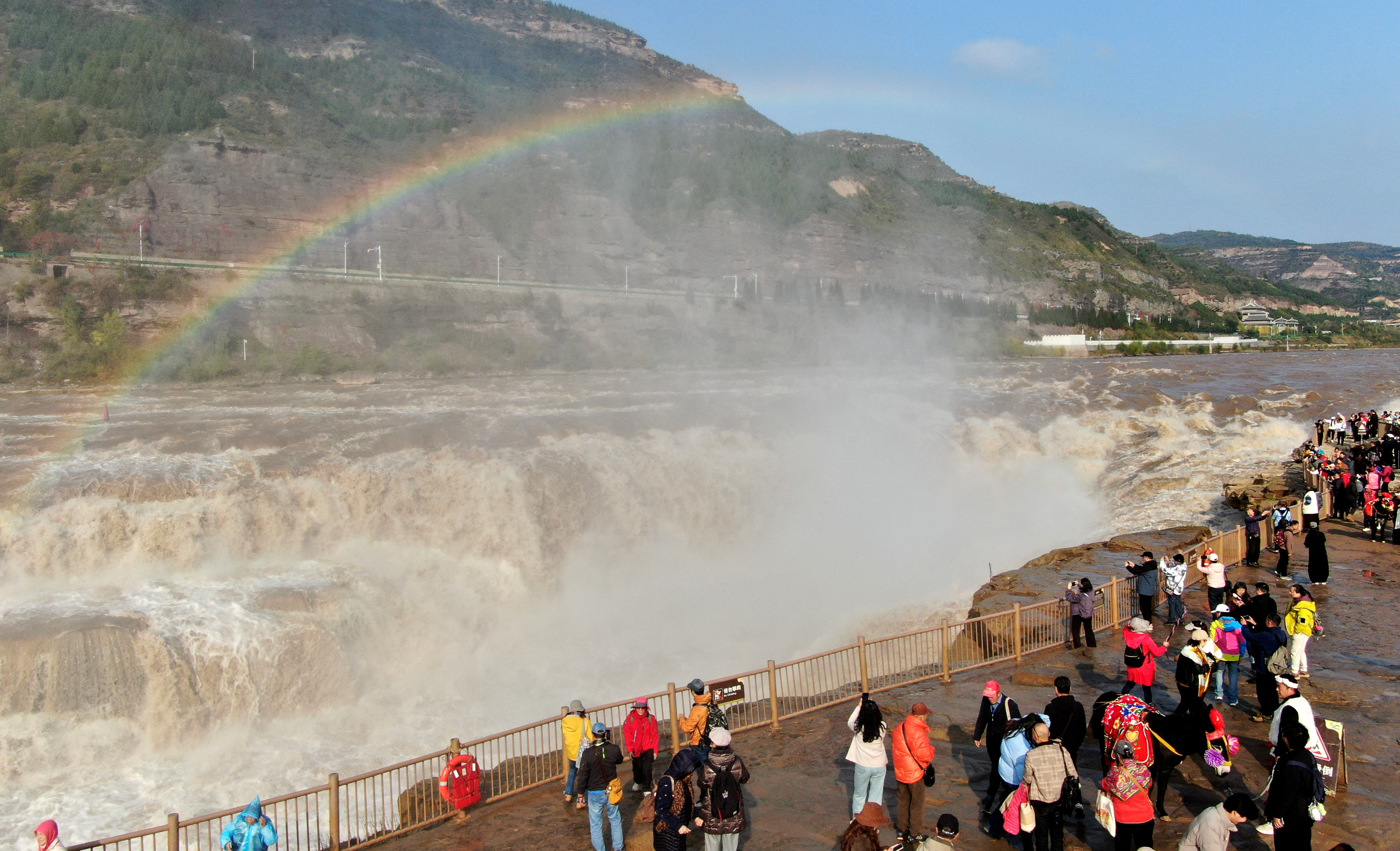10月27日,位于山西吉縣和陜西宜川縣交界的黃河壺口瀑布景區天氣晴好,飛濺的水霧在陽光照射下,形成一道壯美的“彩虹橋”。