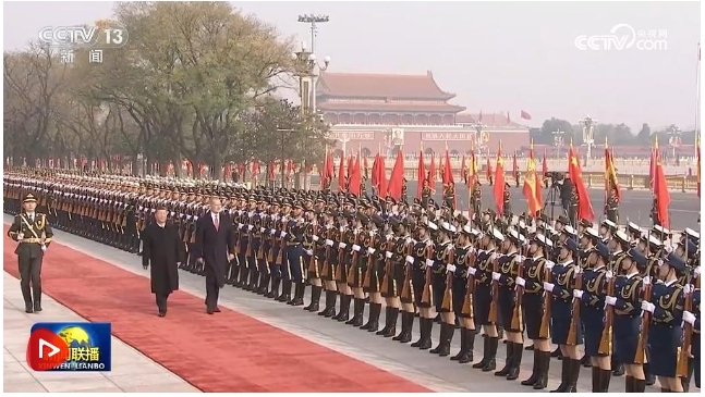 費利佩六世抵達(dá)時,禮兵列隊致敬。習(xí)近平同費利佩六世登上檢閱臺,軍樂團奏中西兩國國歌,天安門廣場鳴放禮炮21響。費利佩六世在習(xí)近平陪同下檢閱中國人民解放軍儀仗隊,并觀看分列式。
