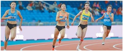 浙江隊選手陳妤頡(左二)在十五運會田徑項目女子200米預賽中。