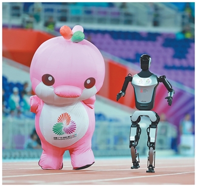 十五運會賽場,吉祥物與機器人互動。